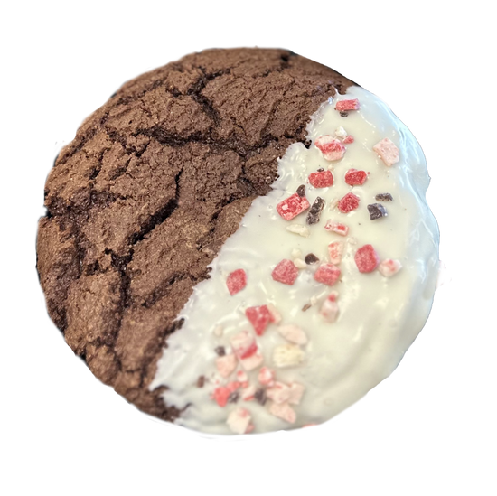 This cookie brings all the holiday cheer—a rich, fudgy chocolate chocolate chip cookie dipped in white chocolate and sprinkled with bits of peppermint bark.